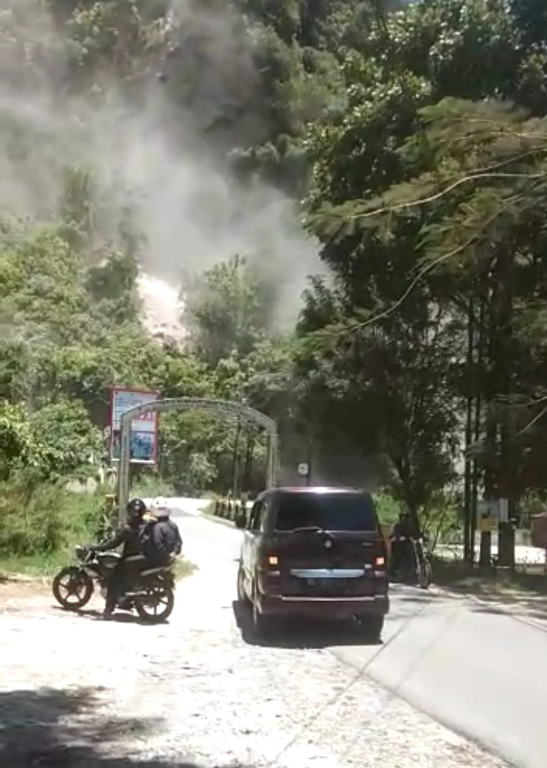 “Diatas bukit masih ada keretakan seperti yang masih kita lihat dibelakang ada kumpulan kumpulan asap adalah keretakan-keretakan pergerakan tanah yang akan jatuh”, tukasnya.