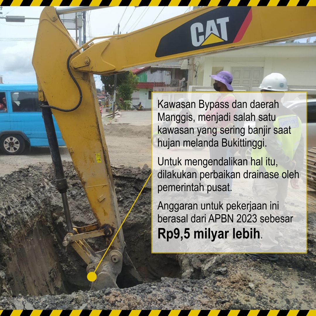 Wali Kota Bukittinggi, melalui Kepala Dinas PUPR, Ebyuleris, menjelaskan, perbaikan drainase ini dilaksanakan pemerintah pusat. Anggaran untuk pekerjaan ini berasal dari APBN 2023 sebesar Rp9,5 milyar lebih.