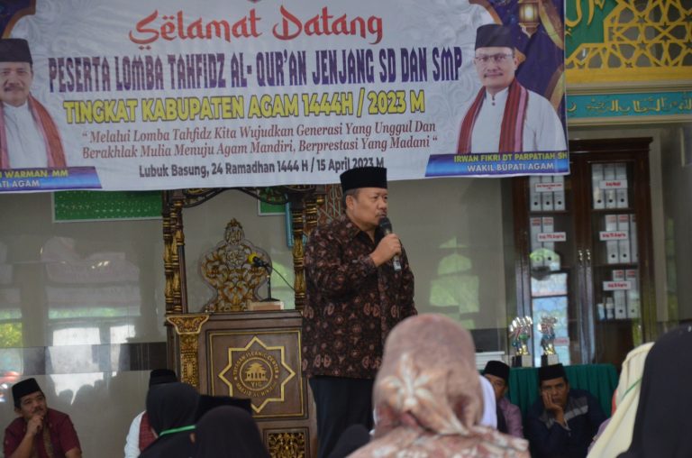 “Ini kita lakukan untuk mencetak pemimpin-pemimpin yang cerdas dan bijaksana. Sehingga kelak dapat membantu membangun Kabupaten Agam menjadi lebih maju dan madani,” kata Andri Warman MM saat membuka lomba tahfiz SD dan SMP tingkat Kabupaten Agam 2023 di Masjid Al-Hikmah Simpang Tigo Lubuk Basung, Sabtu (15/04/23).