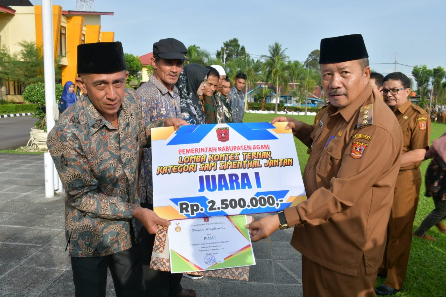 Marawapost.com, Agam – Bupati Agam, Dr H Andri Warman menyerahkan hadiah pada peternak pemenang kontes ternak, di halaman Kantor Bupati Agam, Senin (05/06/23).