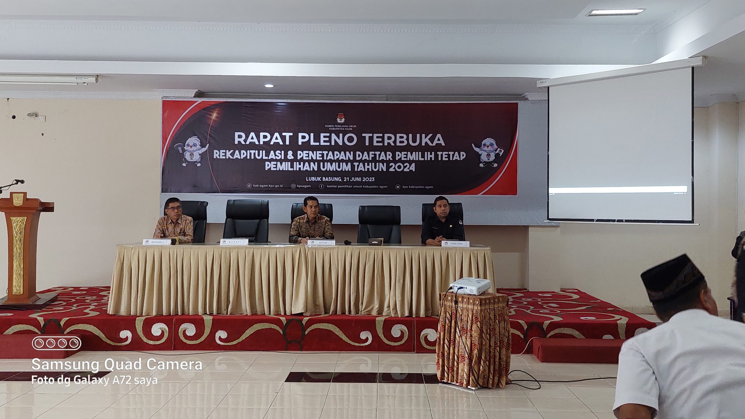 Marawapost.com, Agam – Komisi Pemilhan Umum (KPU) Kabupaten Agam gelar Rapat Pleno Terbuka Rekapitulasi dan Penetapan Daftar Pemilih Tetap Pemilihan Umum (Pemilu) Tahun 2024 di aula Bappeda Lubuk Basung, Rabu (21/06/23).