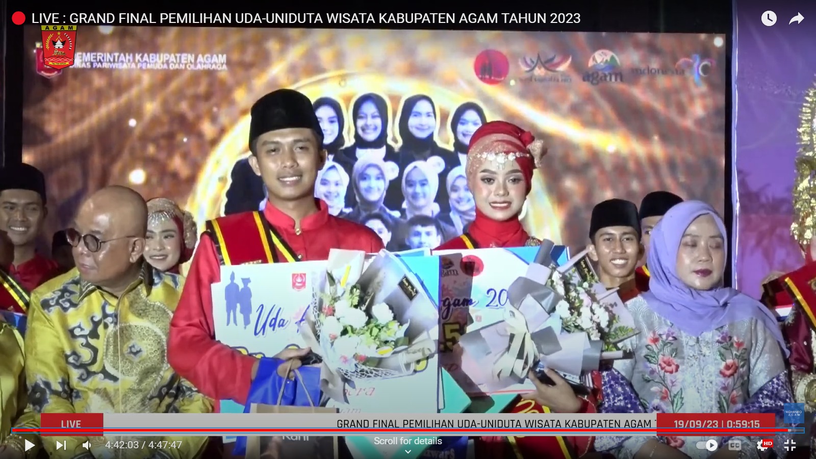 Maulana Ihsan dan Justine Nailah terpilih sebagai Uda dan Uni Duta Wisata Agam tahun 2023. Sementara itu Jayusman dan Raisya Argya Putri terpilih menjadi Uda Uni Wakil 1 serta Hamzah dan Nurul Alma Rahma terpilih menjadi Uda Uni Wakil 2.
