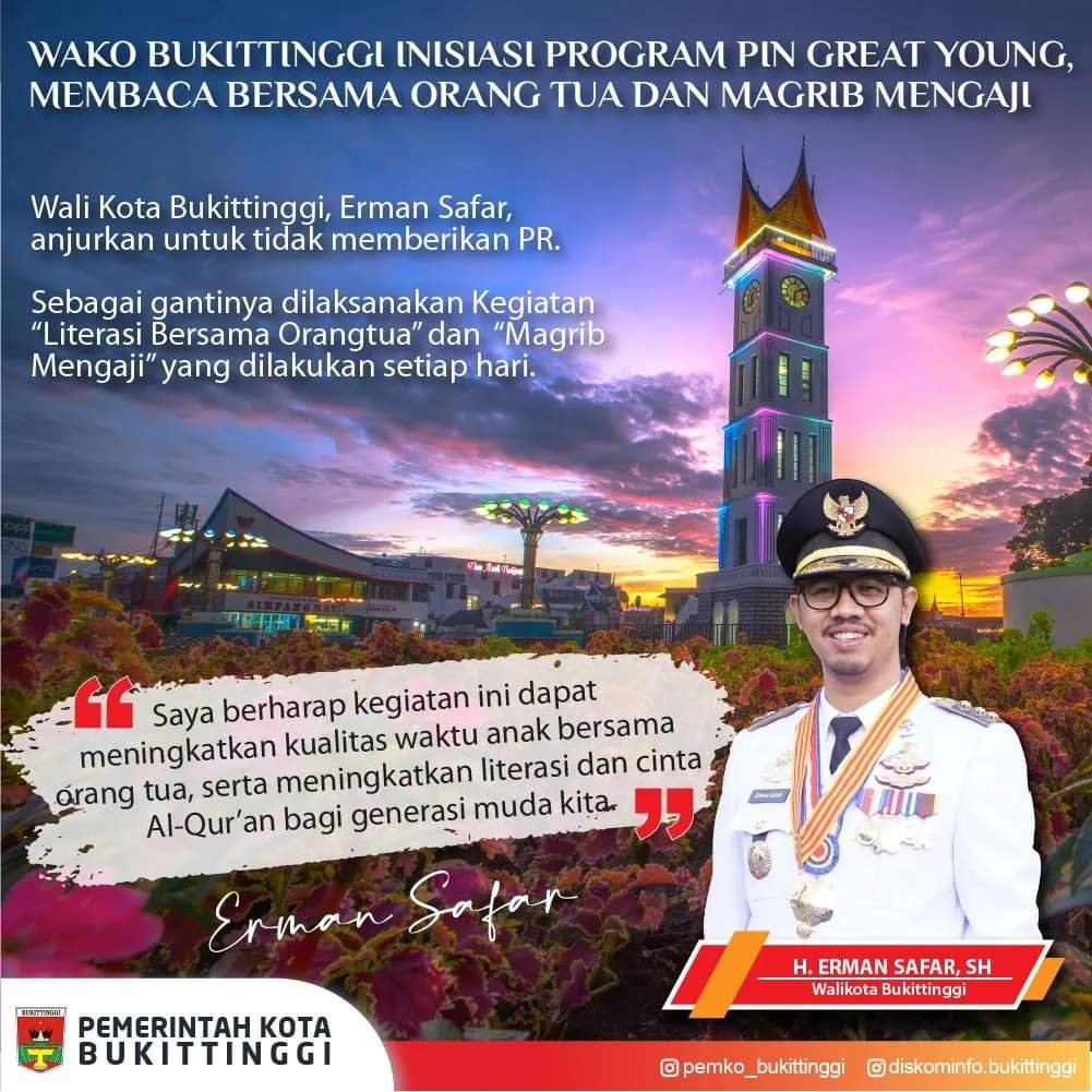 Marawapost.com, Bukittinggi – Wali Kota Bukittinggi, H. Erman Safar, SH, anjurkan setiap satuan pendidikan di Bukittinggi untuk tidak memberikan PR. Kualitas waktu bersama orang tua di rumah diwujudkan dengan program PIN Great Young.