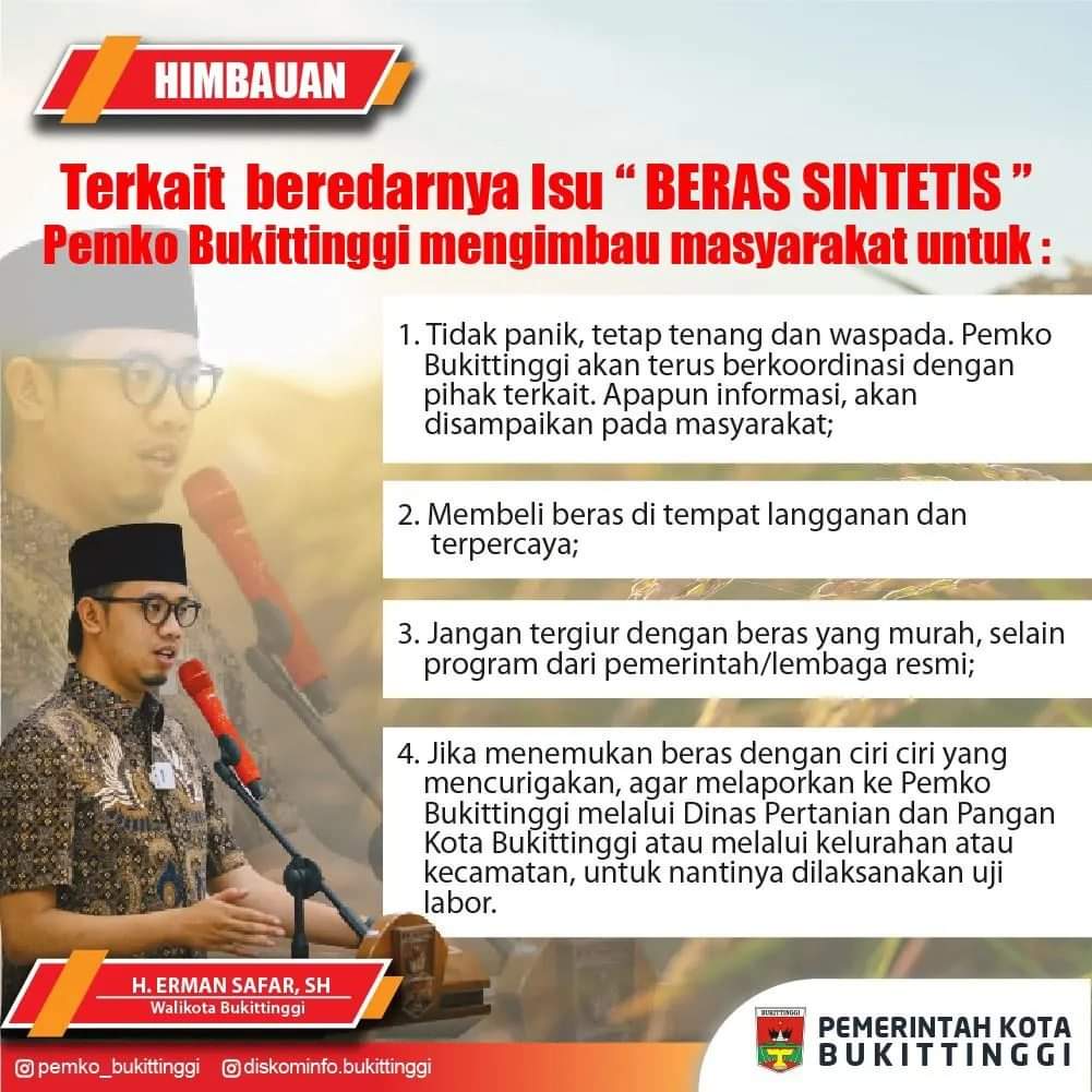 Marawapost.com, Bukittinggi – Terkait beredarnya isu “Beras Sintetis”, Pemko Bukittinggi menghimbau masyarakat untuk :