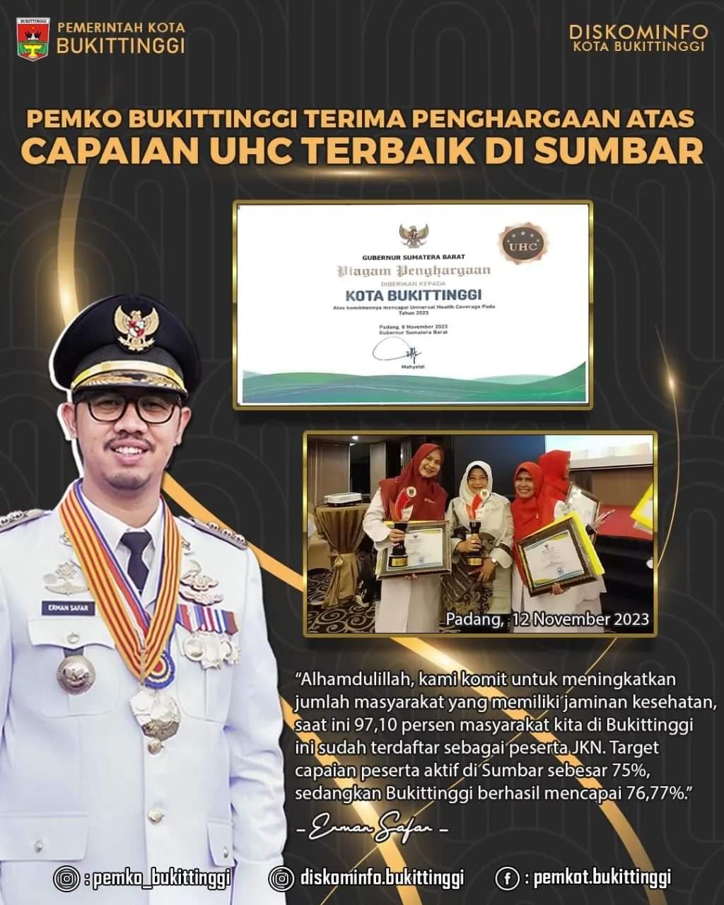 Wali Kota Bukittinggi, melalui Kepala Dinas Kesehatan, Linda Faroza, menjelaskan, Kota Bukittinggi dapat penghargaan, atas capaian UHC terbaik di Sumatra Barat. Pemko Bukittinggi dinilai menjadi daerah paling terbaik dalam memberikan akses pelayanan kesehatan dan memfasilitasi masyarakat dengan cepat terhadap kebutuhan kesehatan, serta usulan kepesertaan jaminan kesehatan masyarakat yang butuh pelayanan kesehatan baru, melalui program Bukittinggi Hebat maupun JKSS.