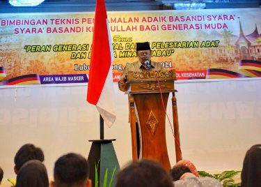 Hal itu merupakan benang merah yang disampaikan Bupati Agam, Dr. H. Andri Warman, MM saat memberikan sambutan pembukaan Bimbingan Teknis Pengamalan ABS-SBK Bagi Generasi Muda yang digelar Dinas Pariwisata Sumbar, Jumat (09/07) malam di Hotel Sakura Syariah Lubuk Basung.