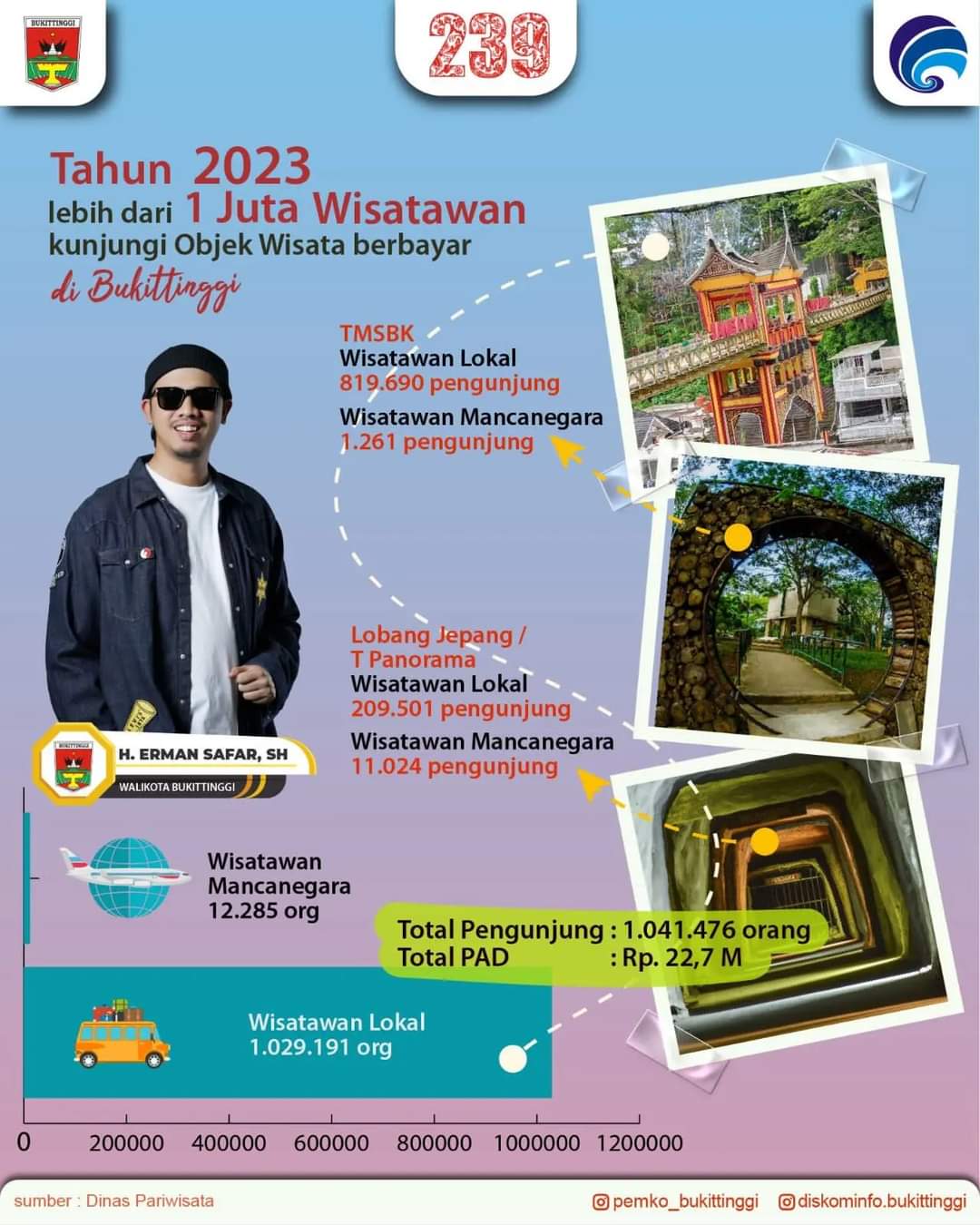 “Selama 2023 total pengujung objek wisata berbayar di Bukittingi sebanyak 1.041.476 orang masuk ke objek wisata berbayar kita, TMSBK, Benteng Fort de Kock dan juga Taman Panorama Lobang Jepang. Selama satu tahun itu, objek wisata berbayar kita itu, menghasilkan PAD sebesar Rp 22.706.416.500,-,” pungkasnya. (*)