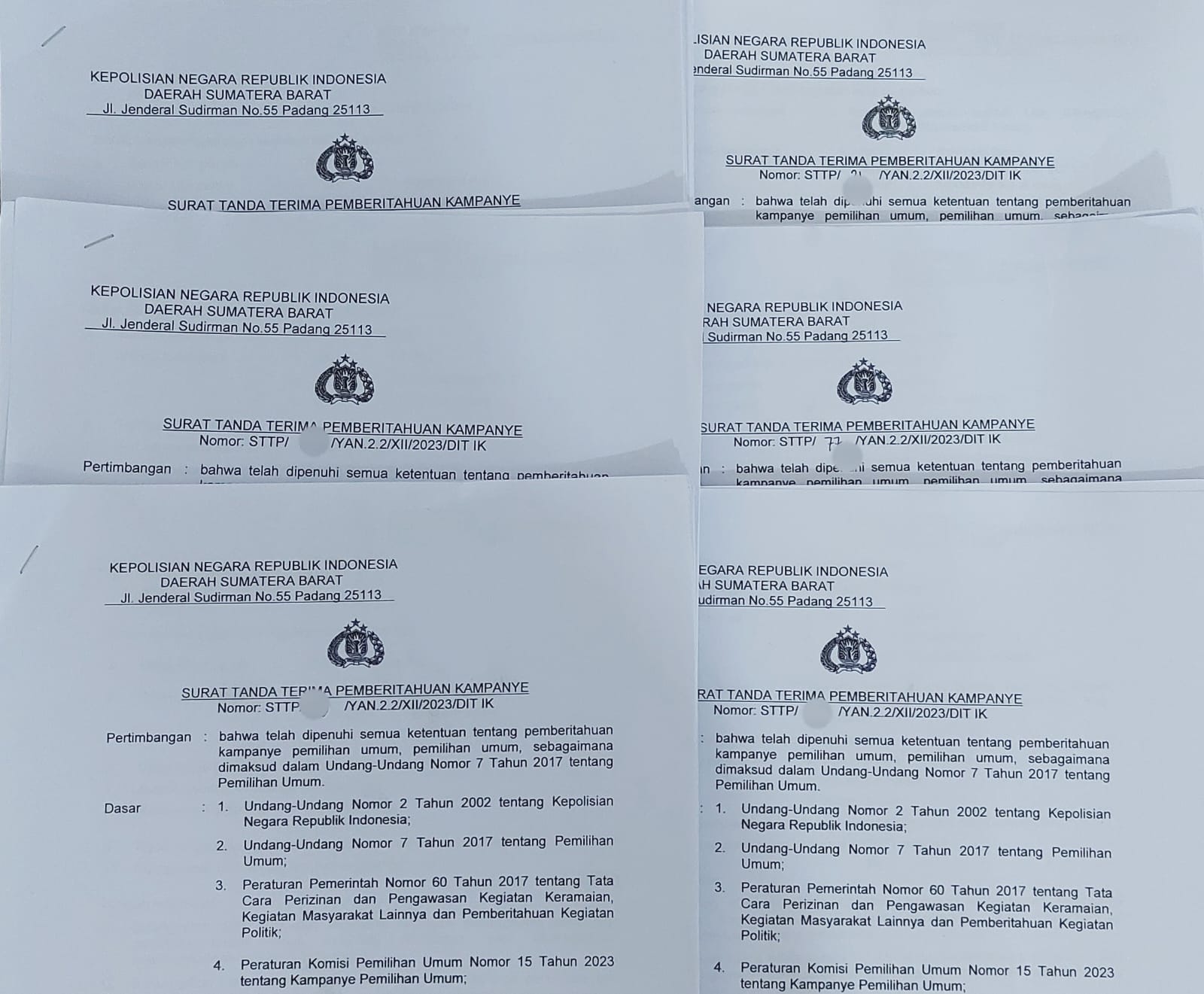 Marawapost.com, Sumbar – Direktorat Intelijen dan Keamanan (Ditintelkam) Polda Sumatera Barat (Sumbar) hingga Senin (23/01/2024) mencatat telah menerbitkan ribuan Surat Tanda Terima Pemberitahuan (STTP) Kampanye Pemilu 2024.
