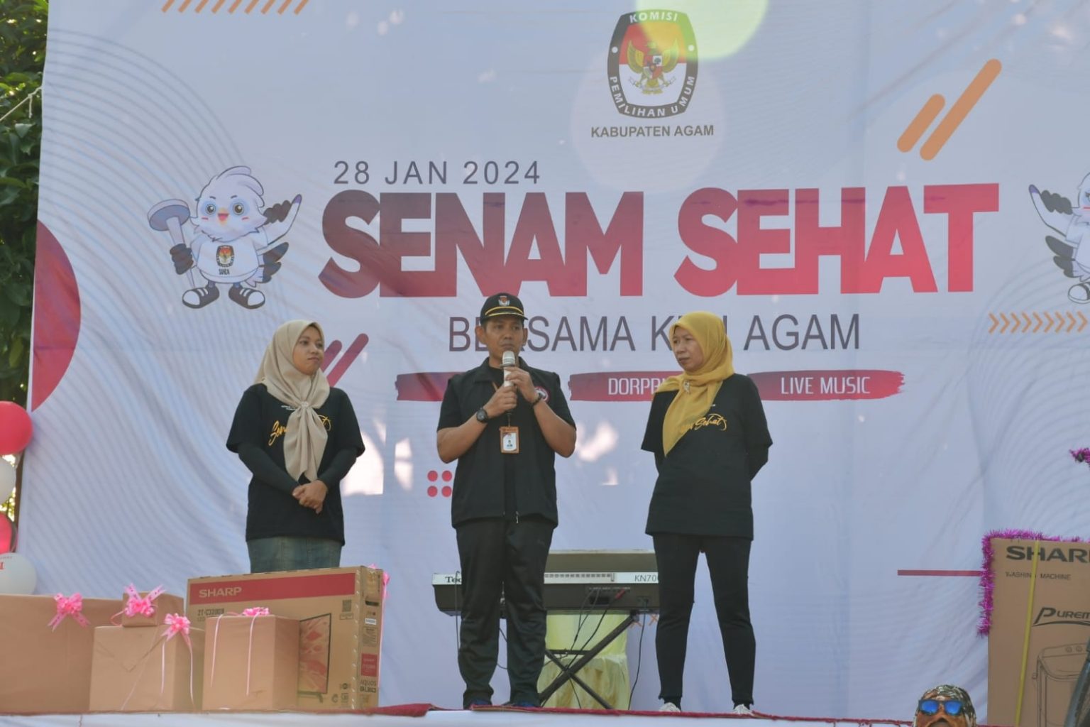 Dalam meningkatkan pemahaman pemilih, KPU Agam mensosialisasikannya kepada pemilih usai senam sehat Pemilu 2024, di depan Kantor Bupati Agam, Minggu (28/01/24).