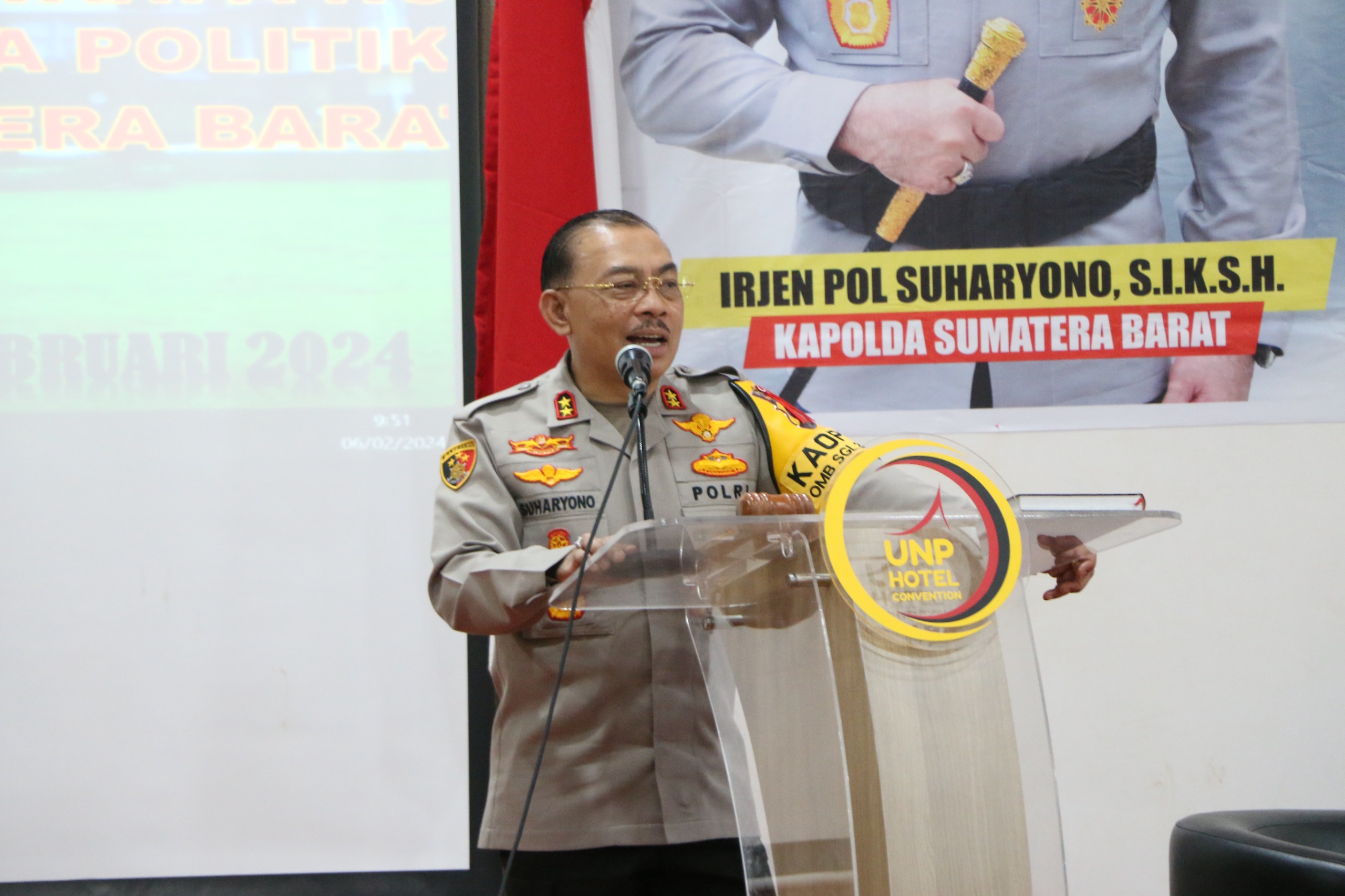 Marawapost.com, Padang – Kapolda Irjen Pol Suharyono, S.Ik. SH membuka Forum Group Discussion (FGD) dalam menjaga Harkamtibmas selama Pemilu 2024 di hotel Universitas Negeri Padang (UNP), Selasa (06/02/24).