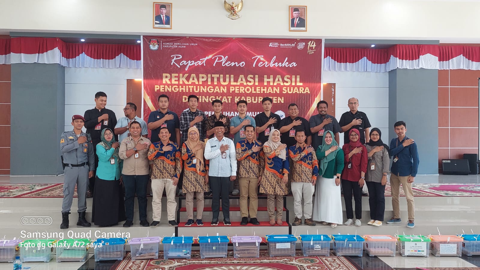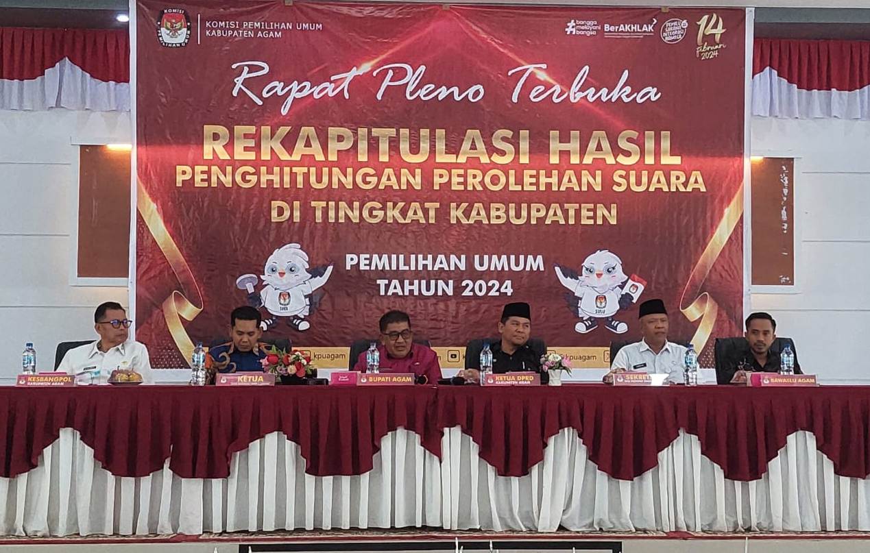 Marawapost.com, Agam – KPU Kabupaten Agam menggelar rapat pleno terbuka penghitungan suara hasil Pemilu Serentak 2024, di Balairung Rumah Dinas Bupati Agam, Kamis (29/02/24).