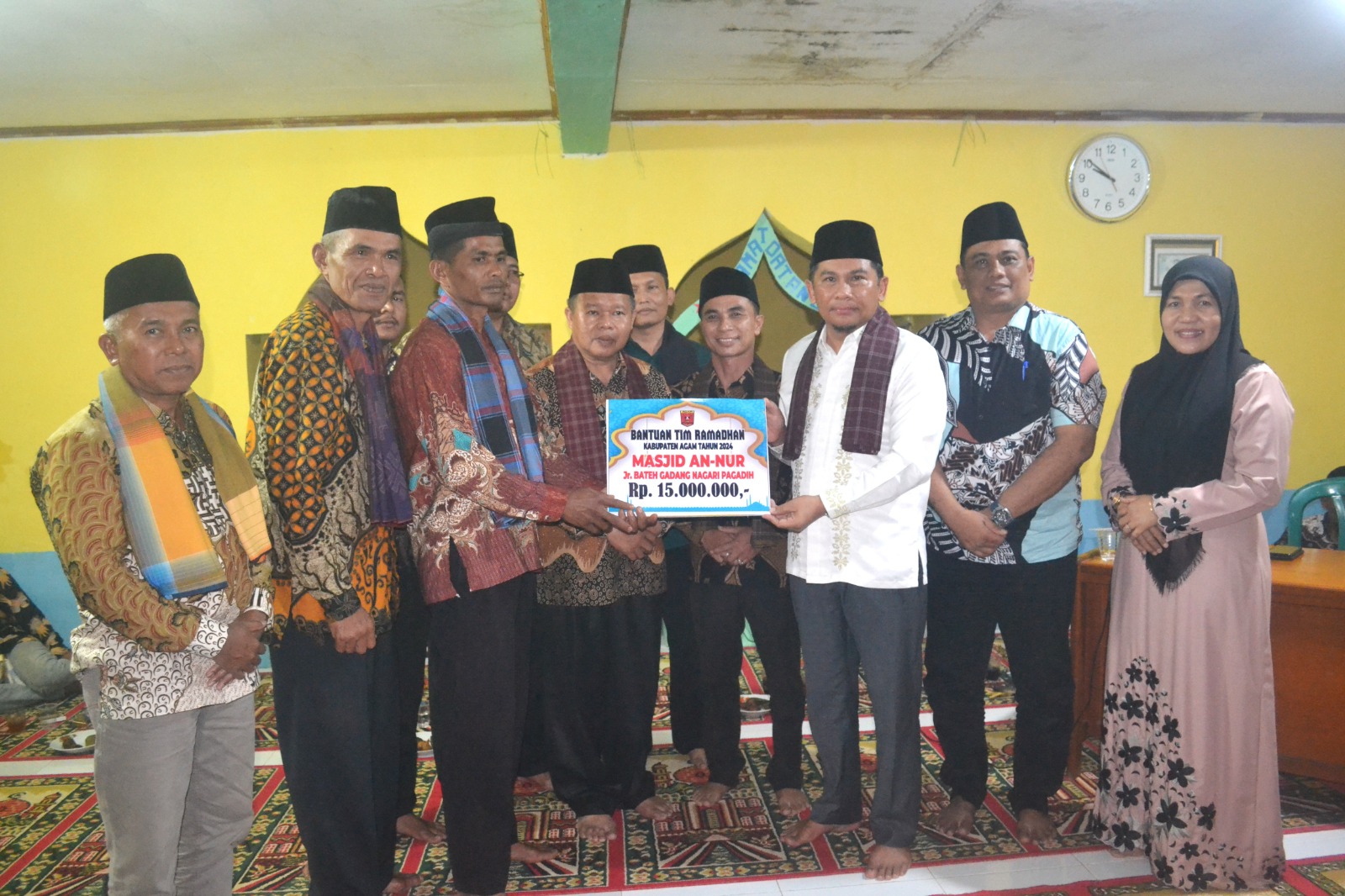 Pada kesempatan itu, Ketua DPRD juga menyerahkan bantuan pembangunan Masjid An-Nur sebesar Rp15 juta rupiah dan bantuan al-qur’an dari Kankemenag Kabupaten Agam.