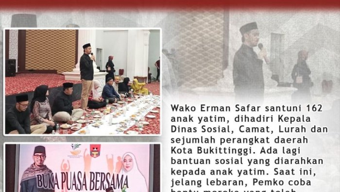 Pada kesempatan itu, Walikota Bukittinggi, Erman Safar mengatakan, banyak program pemerintah yang bisa dilakukan untuk memperhatikan dan membantu masyarakat, termasuk anak yatim. Baik itu pendidikan, termasuk kesejahteraan dari anak yatim, menjadi salah satu target pemerintah kota.