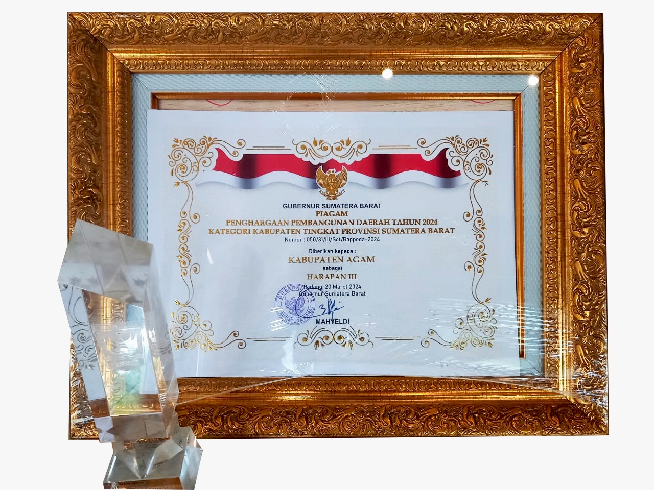 Kabupaten Agam berhasil meraih Harapan III dalam kategori Pembangunan Daerah Tahun 2024 tingkat provinsi Sumatera Barat. Penghargaan ini diserahkan langsung oleh Gubernur Sumatera Barat kepada Bupati Agam yang diwakili oleh Asisten Perekonomian dan Pembangunan Sekretariat Daerah, Ir. Jetson MT, dengan penilaian sangat memuaskan se-Sumatera Barat atas pencapaian rencana aksi daerah pengarusutamaan gender.