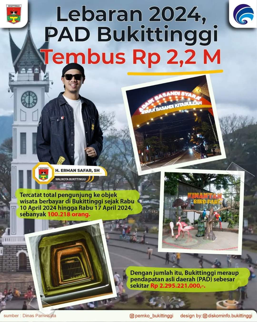 Wali Kota Bukittinggi, Erman Safar, didampingi, Kepala Dinas Pariwisata Kota Bukittinggi, Rofie Hendra, menyampaikan, Pemerintah Kota Bukittinggi mencatat total pengunjung ke objek wisata berbayar, seperti Objek wisata Kebun Binatang atau Taman Marga Satwa dan Budaya Kinantan (TMSBK), Objek Wisata Benteng Fort De Kock, serta Taman Panorama dan Lubang Jepang sejak Rabu 10 April 2024 hingga Rabu 17 April 2024, sebanyak 100.218 orang.