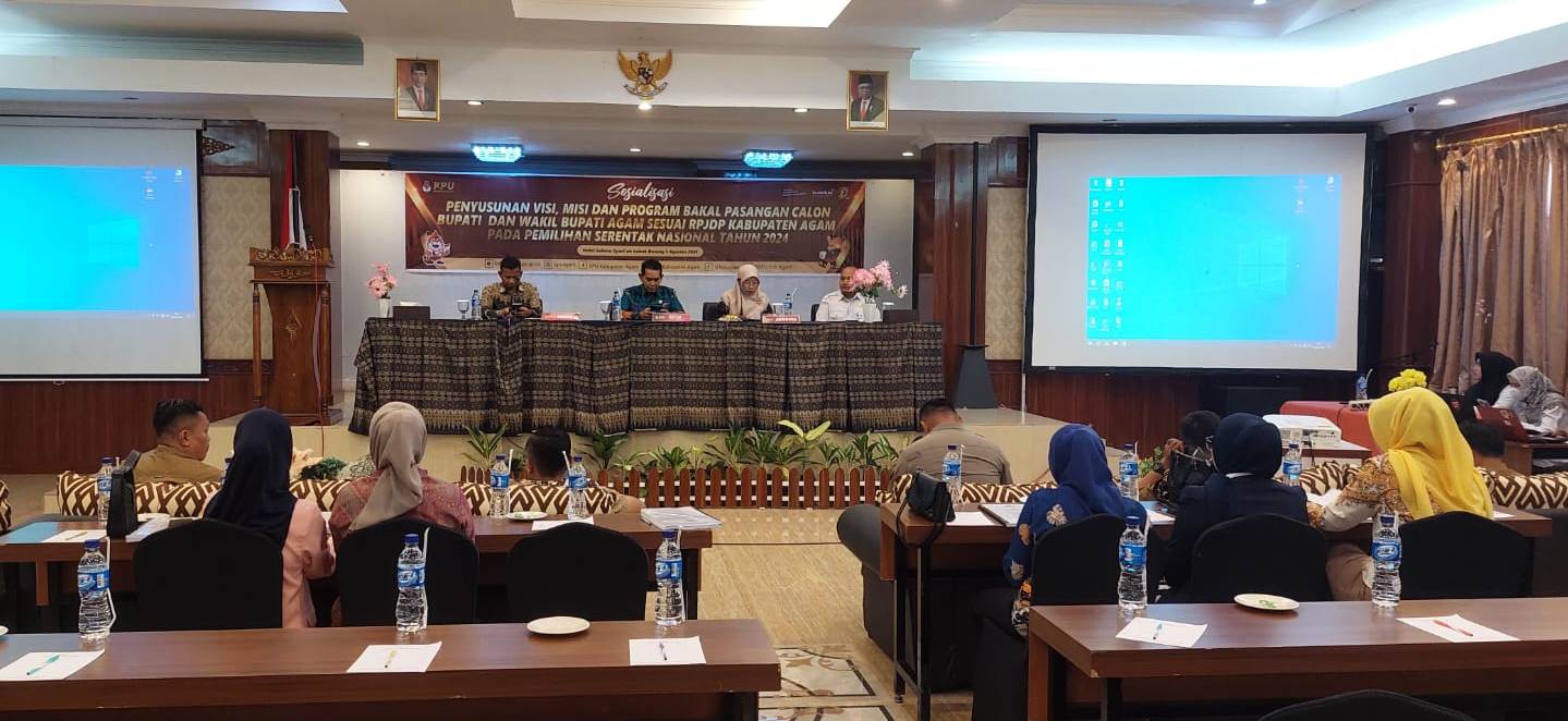 Marawapost.com, Agam – Komisi Pemilihan Umum (KPU) Kabupaten Agam gelar sosialisasi penyusunan visi, misi dan program bakal pasangan calon Bupati dan Wakil Bupati Kabupaten Agam sesuai RPJDP Kabupaten Agam pada pemilihan serentak nasional tahun 2024 di Hotel Sakura Syari’ah Lubuk Basung, Senin (05/08/24).