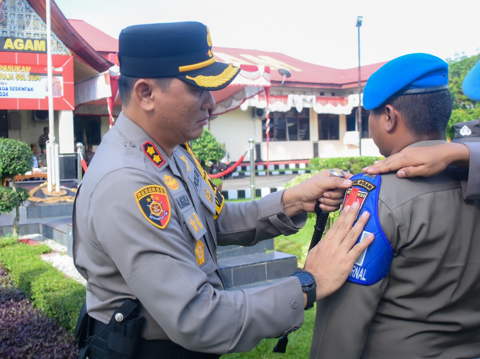 Apel gelar pasukan ditandai dengan pemasangan pita dan pengecekan kelengkapan pasukan oleh Kapolres Agam, AKBP Muhammad Agus Hidayat.