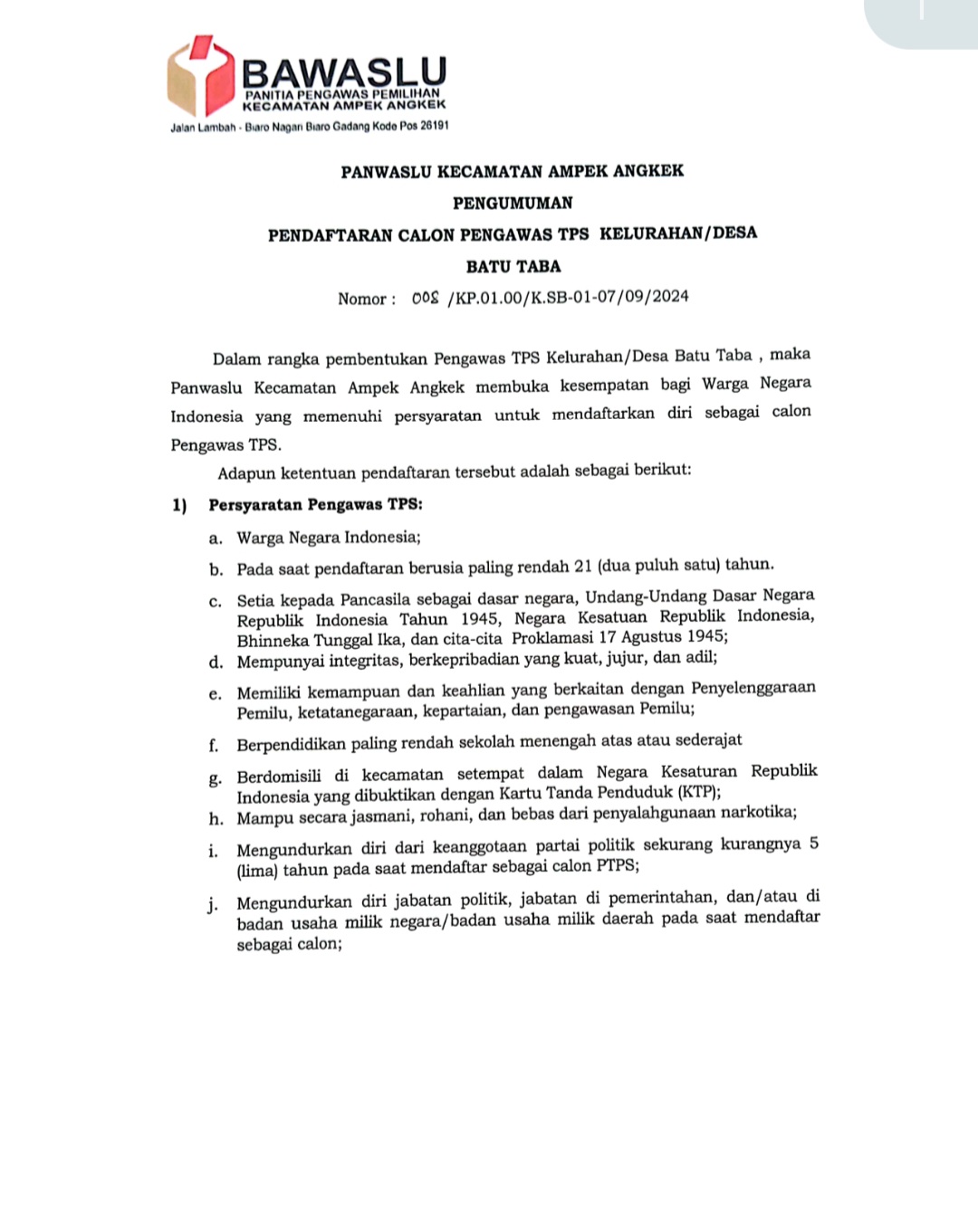 Pengumuman Rekrutmen PTPS Kecamatan Ampek Angkek Post Views: 1,264 Pos terkaitIKPP PBR Riau Bergerak! Ratusan Paket Sembako Disalurkan ke Korban Banjir Bandang dan LongsorDPRD Agam Gelar Rapat Paripurna Terkait Jawaban Bupati Agam Terhadap Pandangan Umum Fraksi Tentang Nota Keuangan APBD 2026Bersama Pemerintah Kabupaten, DPRD Agam Sepakati KUA-PPAS tahun 2026Dilantik Bupati Benni Warlis, Dr. Mhd Lutfi, AR, SH,MSi Resmi Jabat Sekda AgamPanen Raya “Sawah Pokok Murah” di Sawah Laweh Nagari Lubuk Basung Berhasil, Produktivitas Padi MeningkatLuar Biasa, Pemkab Agam Raih WTP Sebelas Kali Berturut – turut Tambahkan Komentar