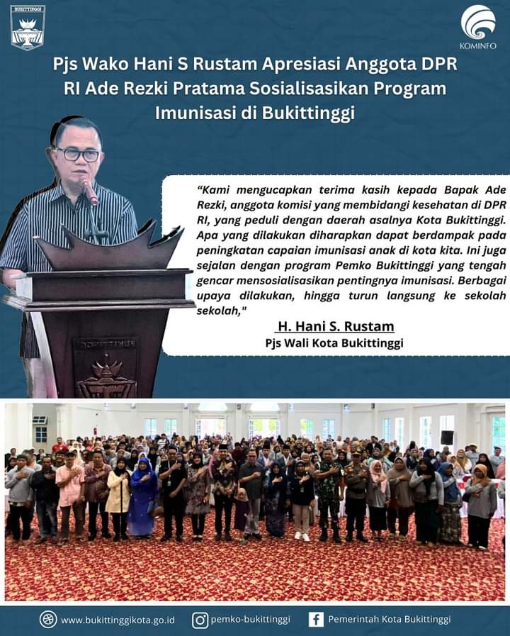 Pjs. Wali Kota Bukittinggi, H. Hani Syopiar Rustam, mengapresiasi dan mendukung penuh kegiatan sosialisasi imunisasi, yang diinisiasi Ade Rezki Pratama selaku Anggota DPR RI, dari daerah pemilihan (dapil) 2 Sumbar. Hal ini sejalan dengan apa yang tengah dilakukan Pemko Bukittinggi, untuk meningkatkan capaian imunisasi dasar lengkap anak.