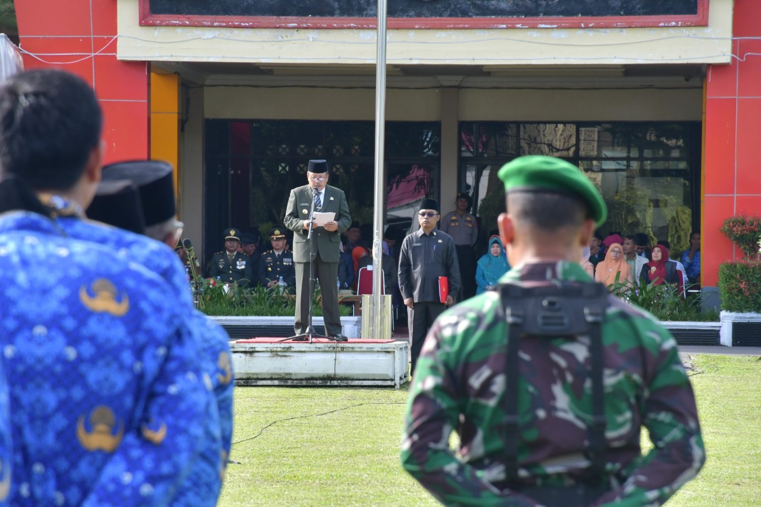 Upacara tersebut berlangsung di halaman Kantor Bupati Agam, Senin (25/11/24) ini dihadiri oleh Forkopimda Agam, para kepala Organisasi Perangkat Daerah (OPD) Agam, guru, tenaga medis, serta siswa SMA.