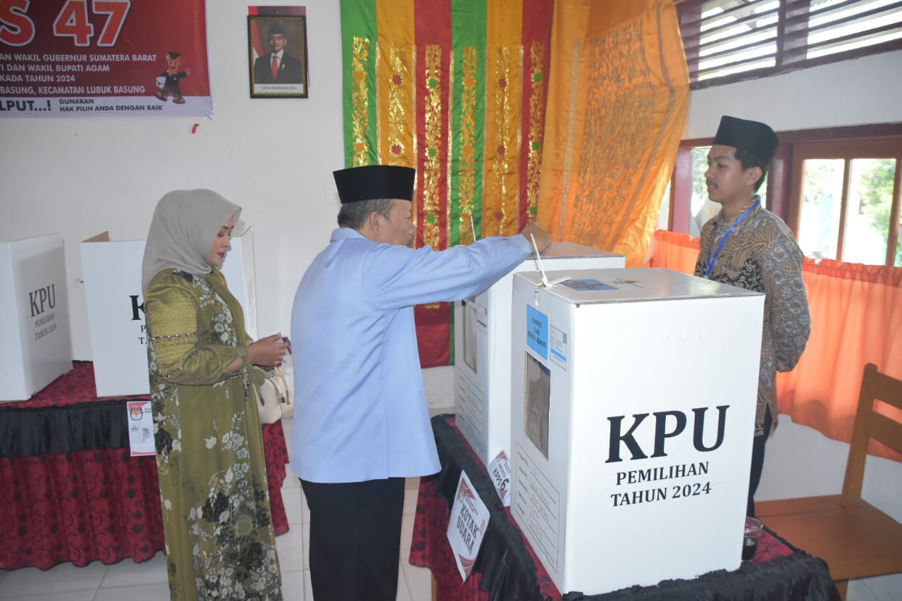 Marawapost.com, Agam – Bupati Agam, Dr Andri Warman MM bersama Ketua Tim Penggerak PKK Kabupaten Agam, Ny Yenni Andri Warman menggunakan hak pilihnya di TPS 47 Nagari Lubuk Basung, Kecamatan Lubuk Basung, Rabu (27/11/24).