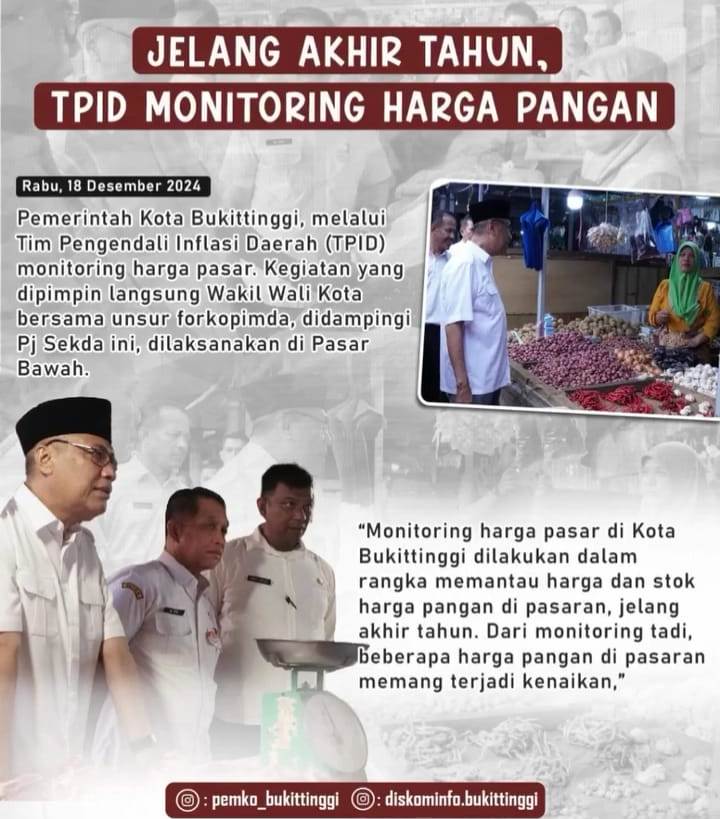 Marawapost.com, Bukittinggi – Pemerintah Kota Bukittinggi, melalui Tim Pengendali Inflasi Daerah (TPID) monitoring harga pasar. Kegiatan yang dipimpin langsung Wakil Wali Kota bersama unsur Forkopimda, didampingi Pj Sekda ini, dilaksanakan di Pasar Bawah, Rabu, 18 Desember 2024.