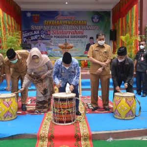 Launching ditandai pemukulan tambua oleh Bupati Agam, Dr. H. Andri Warman, didampingi Kepala Disdikbud Agam, Isra, kepala sekolah dan alumni SMPN 1 Banuhampu dan lainnya.