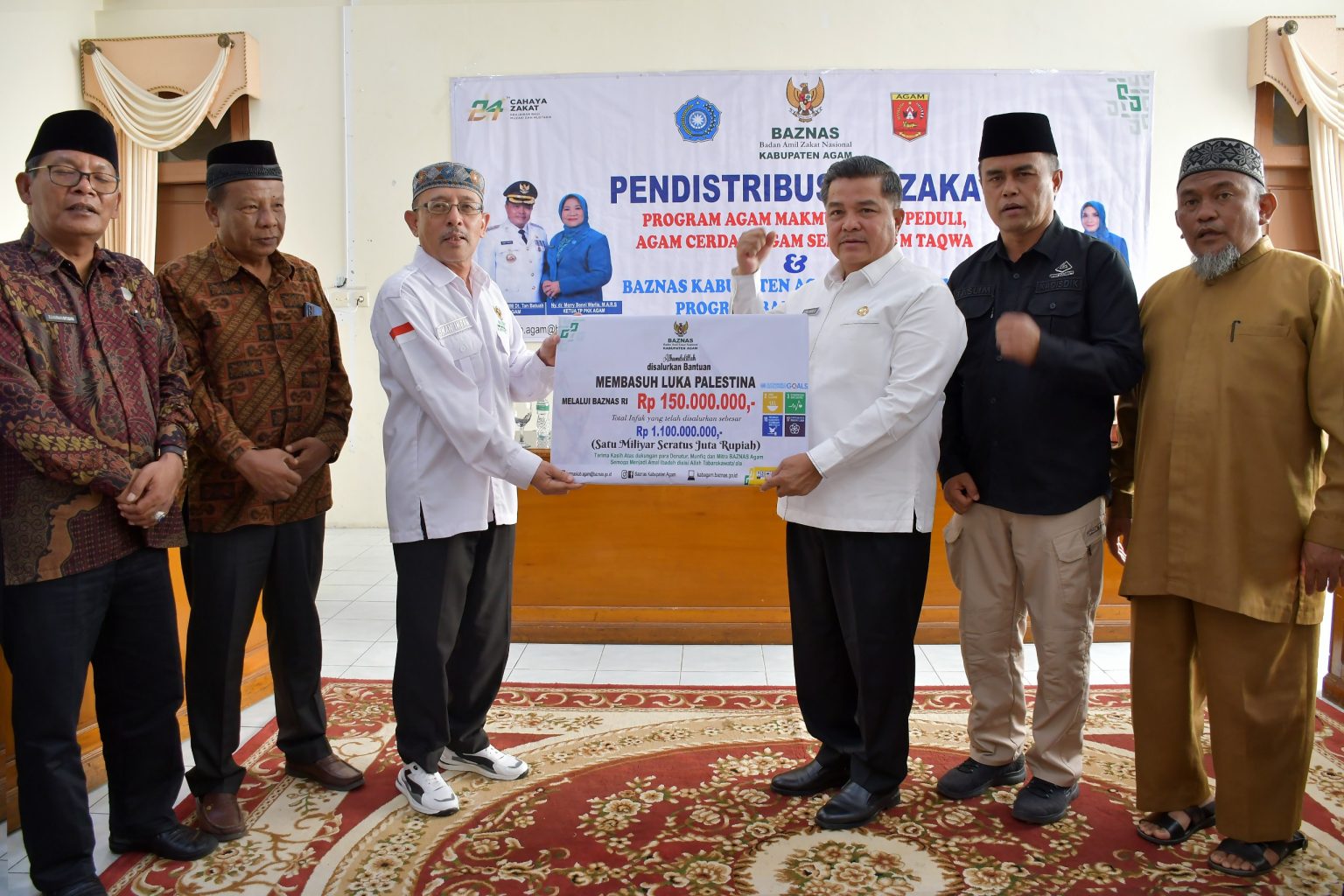 Penyaluran zakat secara simbolis dilakukan Bupati Agam, Benni Warlis kepada perwakilan mustahik. Turut dihadiri Kankemenag Agam, pimpinan OPD, camat dan Baznas Bukittinggi.
