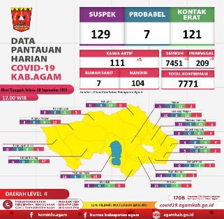 Agam, Marawa – Kabupaten Agam melalui Dinas Kesehatan catatkan penambahan 5 kasus terkonfirmasi Covid-19 Selasa (28/9) ini, sehingga total terkonfirmasi menjadi 7.771 kasus.