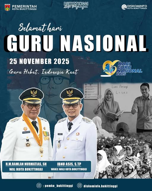 Marawapost.com, Bukittinggi – Pemerintah Kota (Pemko) Bukittinggi mengucapkan selamat hari guru pada tanggal 25 November 2025 dan menyampaikan apresiasi setinggi tingginya kepada sosok yang menjadi pelita dalam menerangi kehidupan setiap anak bangsa.