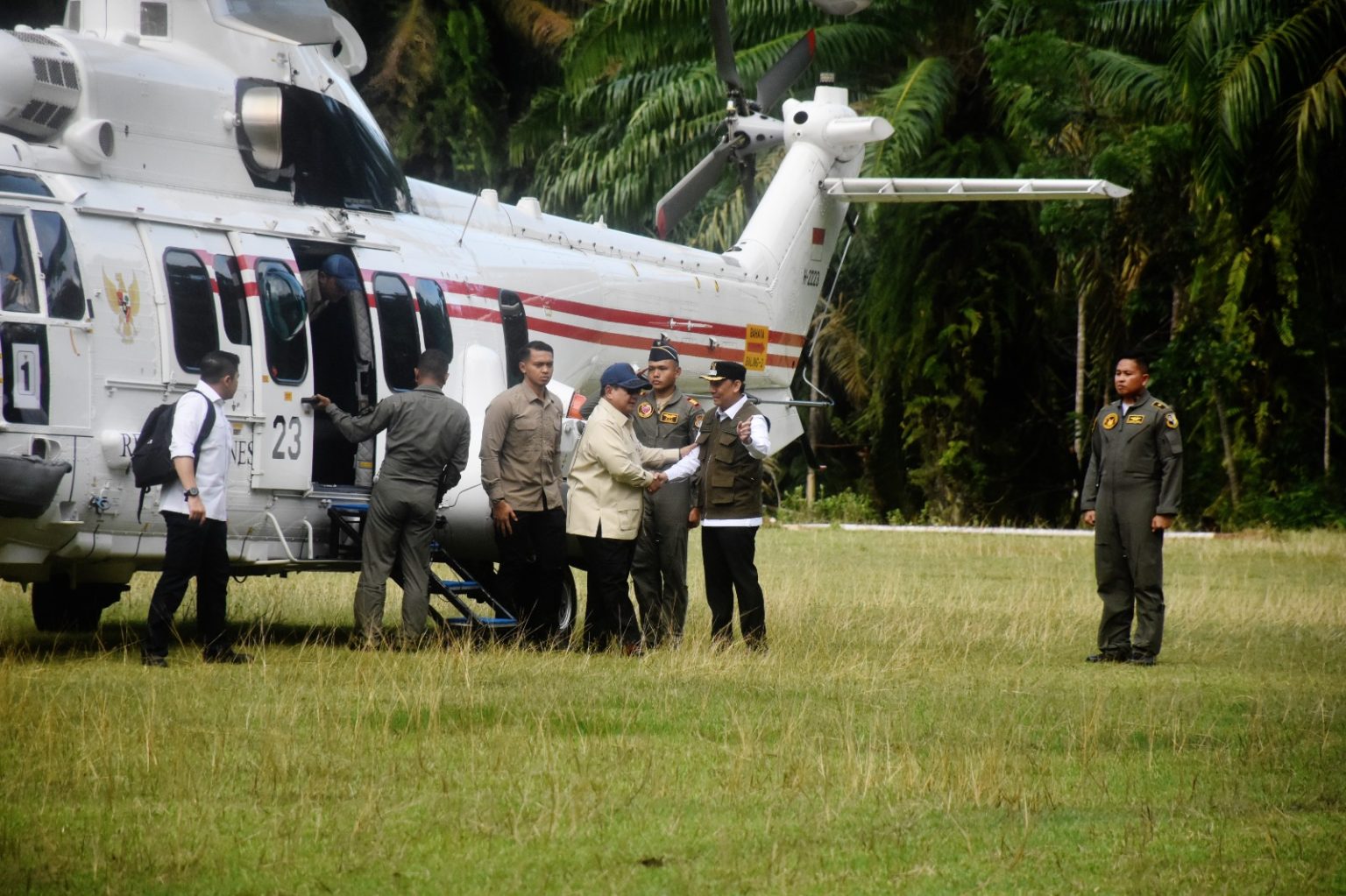 Sebelum melanjutkan agenda peninjauan lapangan ke lokasi pengungsian dan hunian sementara (huntara), Presiden Prabowo Subianto menyempatkan diri menyapa dan beramah- tamah dengan warga di sekitar lokasi pendaratan.
