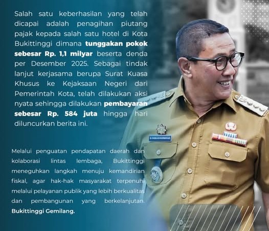 “Capaian ini diharapkan menjadi pengingat bagi masyarakat dan wajib pajak untuk terus meningkatkan kepatuhan sebagai bagian dari tanggung jawab bersama. Pemerintah Kota Bukittinggi berkomitmen menegakkan aturan secara adil dan proporsional, sekaligus memperluas kerja sama dengan Kejaksaan dalam berbagai aspek tata kelola, pendampingan hukum, dan penguatan akuntabilitas, demi mendukung pembangunan dan pelayanan publik yang lebih baik,” tambahnya.