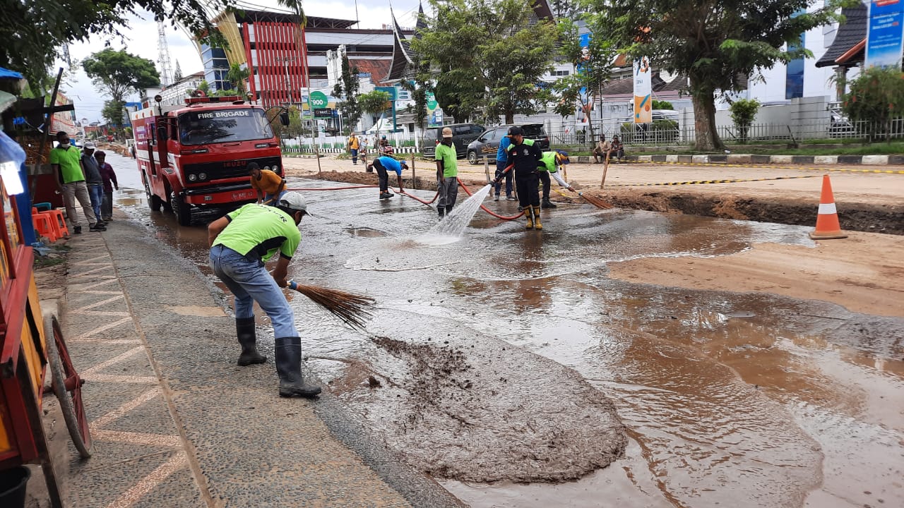 Setidaknya 50 orang personil Dinas PUPR dengan diperkuat 2 unit armada mobil Pemadam Kebakaran, , Skid Loader, dan juga 2 unit Mobil Penyemprotan Taman Dinas Lingkungan Hidup berada di lokasi untuk melakukan pembersihan. Pada pukul 11.30 WIB terpantau lokasi telah berangsur bersih dari material sisa pekerjaan proyek. (R)