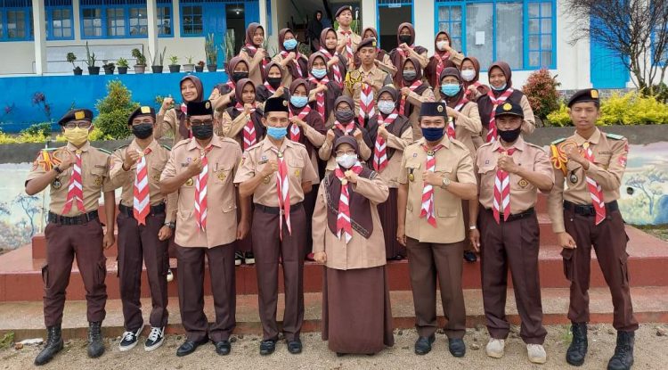 Masker tersebut diserahkan dan dipasangkan secara simbolis kepada anggota pramuka penegak SMAN 1 Banuhampu, selaku anggota pramuka peduli pengurangan risiko pandemi Covid-19. (R)