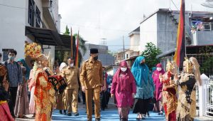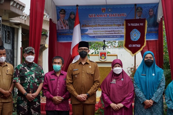 Bukittinggi, Marawa – Wali Kota Bukittinggi Erman Safar didampingi Ketua TP PKK Ny. Fiona Erman Safar beserta jajaran di lingkungan Pemko Bukittinggi sambut kedatangan Tim Penilai Verifikasi Lapangan Lomba Ketua Kelompok Dasawisma Berprestasi Tingkat Provinsi Sumatra Barat Tahun 2022 yang dipimpin Ketua TP PKK Provinsi Sumatera Barat Ny. Harneli Mahyeldi, Selasa (15/02/2022). Kedatangan Tim Penilai tersebut dilakukan langsung di lokasi Kelompok Dasawisma Bunga Biru 10, RT 03 RW 02 Kelurahan Birugo, setelah terpilih masuk nominasi 5 besar tingkat Kota pada tahap I lomba yang diselenggarakan 2 Februari 2022 lalu di Padang.
