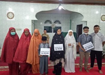 Santunan disalurkan, Sabtu (24/04) malam, sebelum pelaksanaan salat tarawih dan penerima sengaja dihadirkan ke Masjid Baiturahmah.