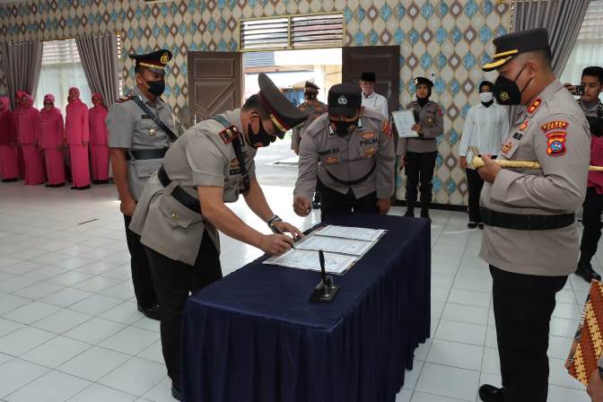 Proses serah terima jabatan Kasat Narkoba Polres Agam dari pejabat lama Iptu Awal Rama, S.E kepada AKP Aleyxi Aubedillah, S.H. itu dipimpin langsung oleh Kapolres Agam AKBP Ferry Ferdian, S.I.K di Aula Wibosono Polres Agam, Jumat (10/06/22)