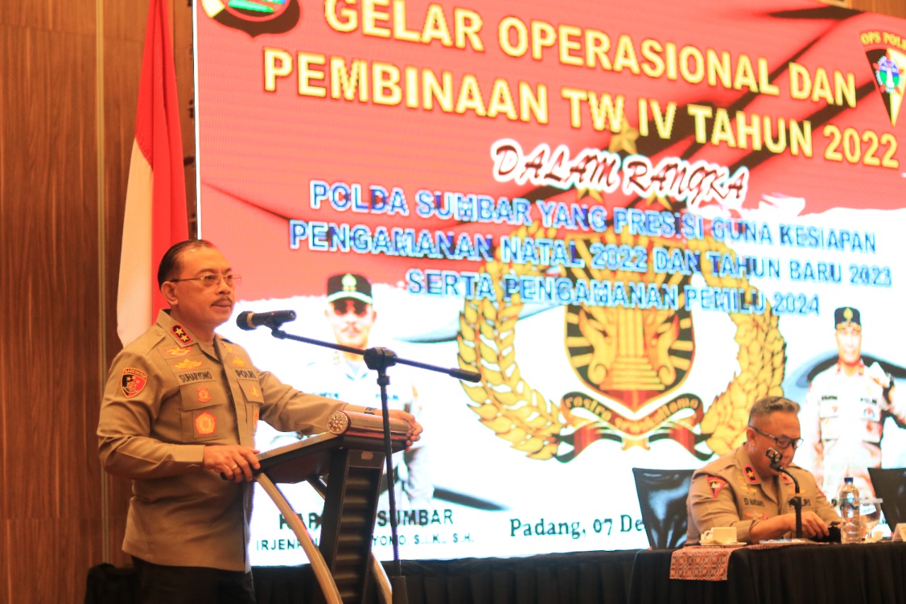 Marawapost.com, Sumbar – Kapolda Sumbar Irjen Pol Suharyono, S.I.K., S.H memimpin Gelar Operasi (GO) bulanan di jajaran Polda Sumbar. GO tersebut diadakan di ballroom Grand Zury Hotel Padang, Rabu (07/12/22).