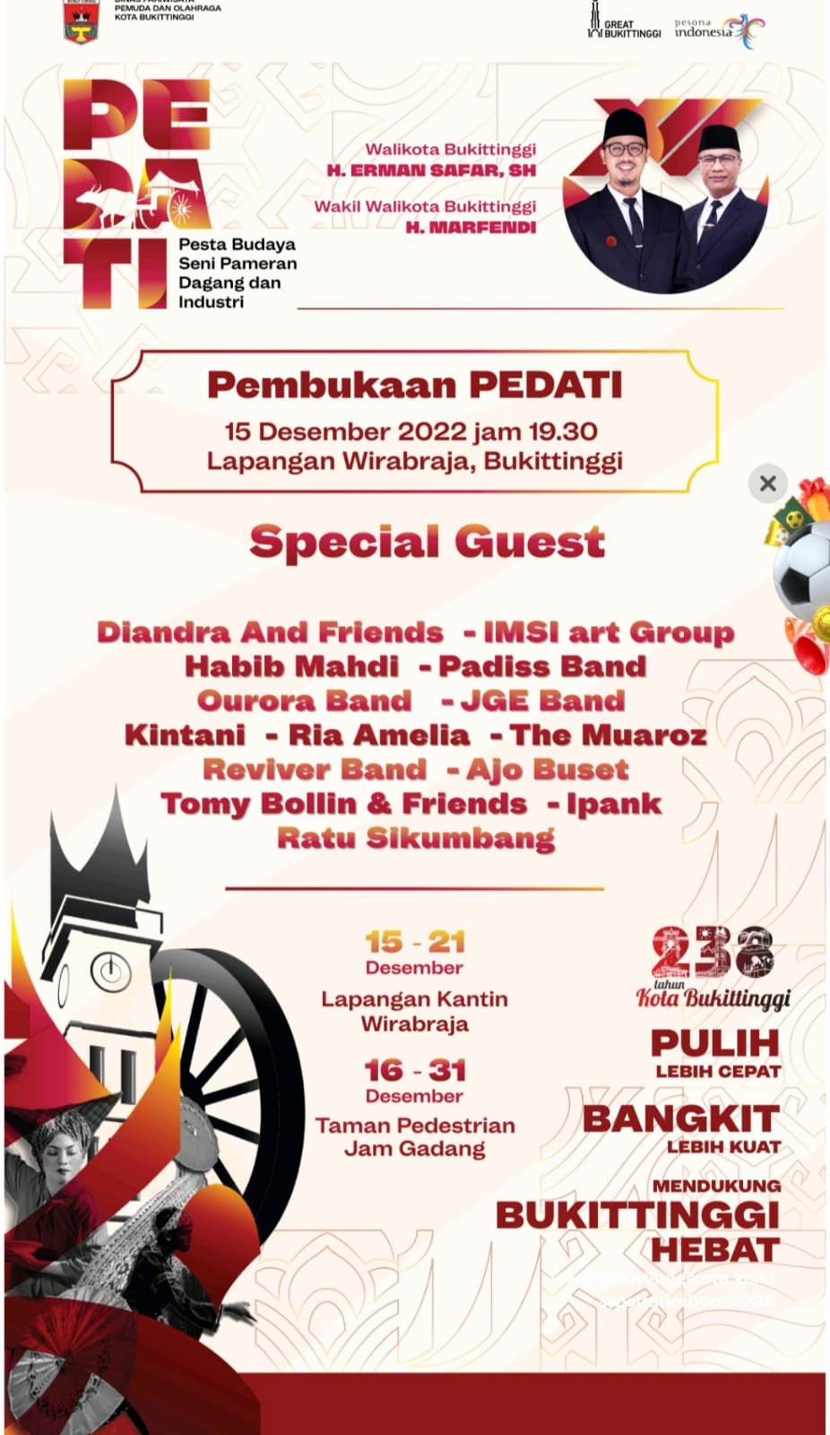 Bukittinggi, Marawa – Pemerintah Kota Bukittinggi bakal gelar iven Pesta Budaya, Seni, Pameran, Dagang dan Industri (Pedati) XII pada tangal 15-31 Desember 2022. Kegiatan ini digelar sekaligus untuk memeriahkan Hari jadi Kota Bukittinggi ke-238 yang diperingati setiap tanggal 22 Desember.