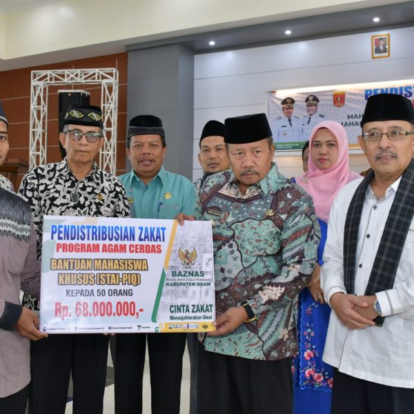 Marawapost.com, Agam – Baznas Kabupaten Agam kembali salurkan zakat melalui program Agam Cerdas sebesar Rp160 juta kepada 142 mahasiswa, di Balairung rumah dinas Bupati Agam, Kamis (30/03/23).