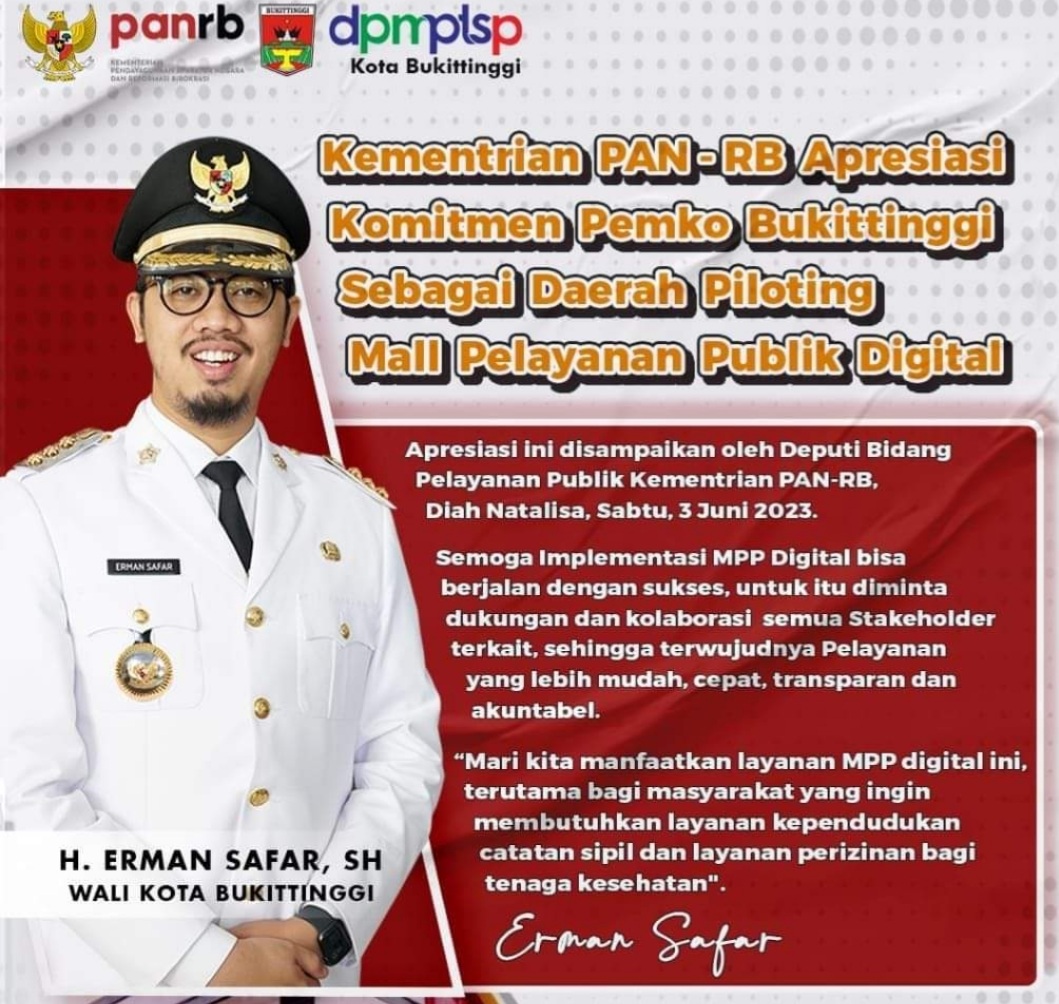 Wali Kota Bukittinggi, Erman Safar, menghimbau masyarakat untuk dapat manfaatkan layanan MPP digital ini, terutama bagi masyarakat yang ingin membutuhkan layanan kependudukan catatan sipil dan layanan perizinan bagi tenaga kesehatan. (*)