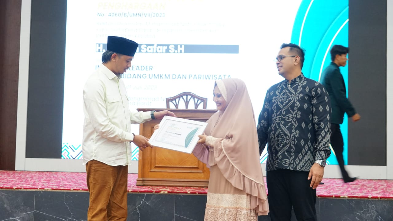 Marawapost.com, Bukittinggi – Wali Kota Bukittinggi, H. Erman Safar, SH, terima penghargaan inovatif Leader bidang UMKM dan Pariwisata dari Universitas Mohammad Natsir Bukittinggi. Penghargaan itu, diberikan dalam rangkaian Tabligh Akbar bersama Ustadz Koh Dennis Lim, di Balairung rumah dinas wako, Sabtu (01/07/23).