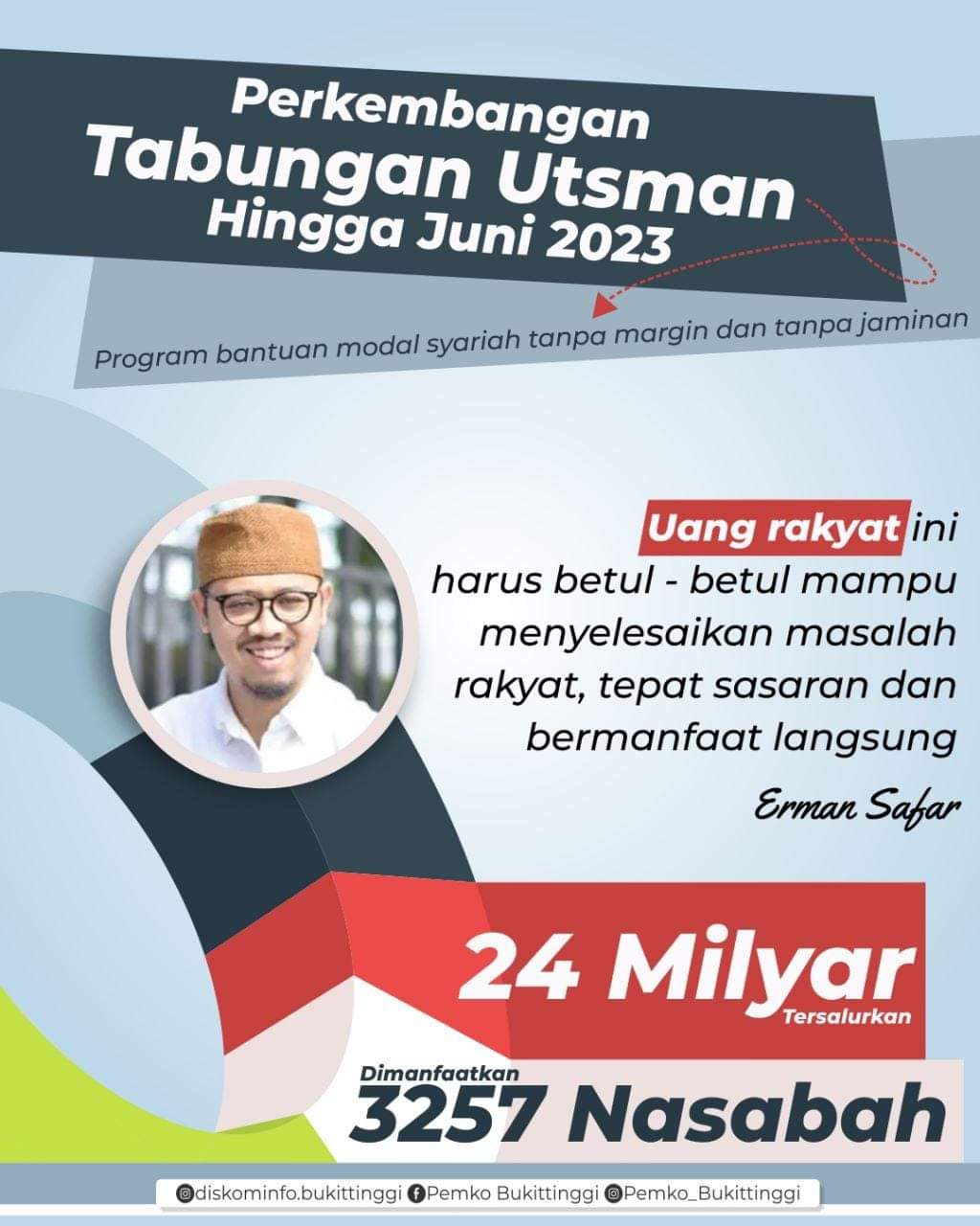 Wali Kota Bukittinggi, Erman Safar, didampingi Direktur BPR Syariah Jam Gadang, Fery Irawan, Jum’at (07/07/23) menjelaskan, Tabungan Utsman dari launcing tahun 2022 hingga Juni tahun 2023 sudah 3275 pedagang kecil sudah memanfaatkan Tabungan Utsman, bantuan modal syariah tanpa margin dan tanpa jaminan, sebanyak Rp 24.924.800.000,- sudah tersalurkan dari tanggal 20 Januari 2023, hingga 4 Juni 2023, tercatat 1456 nasabah Tabungan Utsman dengan jumlah plafond Rp 13 milyar lebih.