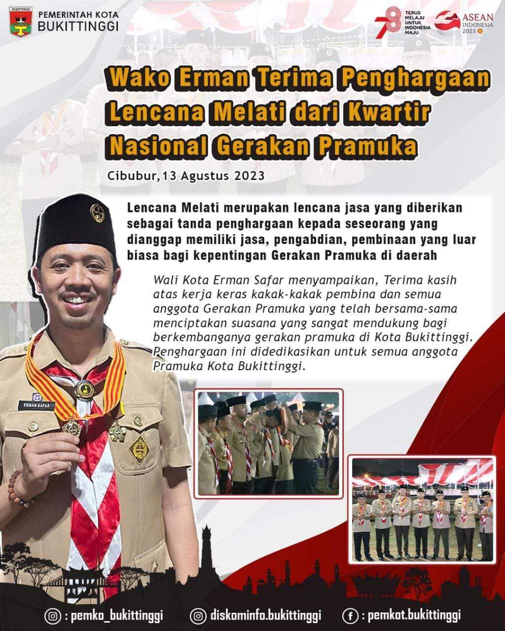 Marawapost.com, Bukittinggi – Wali Kota Bukittinggi, Erman Safar terima Penghargaan Lencana Melati yang disematkan langsung oleh Ketua Kwarnas Gerakan Pramuka, Komjen Pol (Purn) Budi Waseso. Penghargaan ini diberikan dalam acara Upacara Renungan dan Ulang Janji Peringatan Hari Pramuka ke-62 Tahun 2023, di Lapangan Utama Bumi Perkemahan dan Graha Wisata Pramuka Cibubur, Minggu, 13 Agustus 2023.