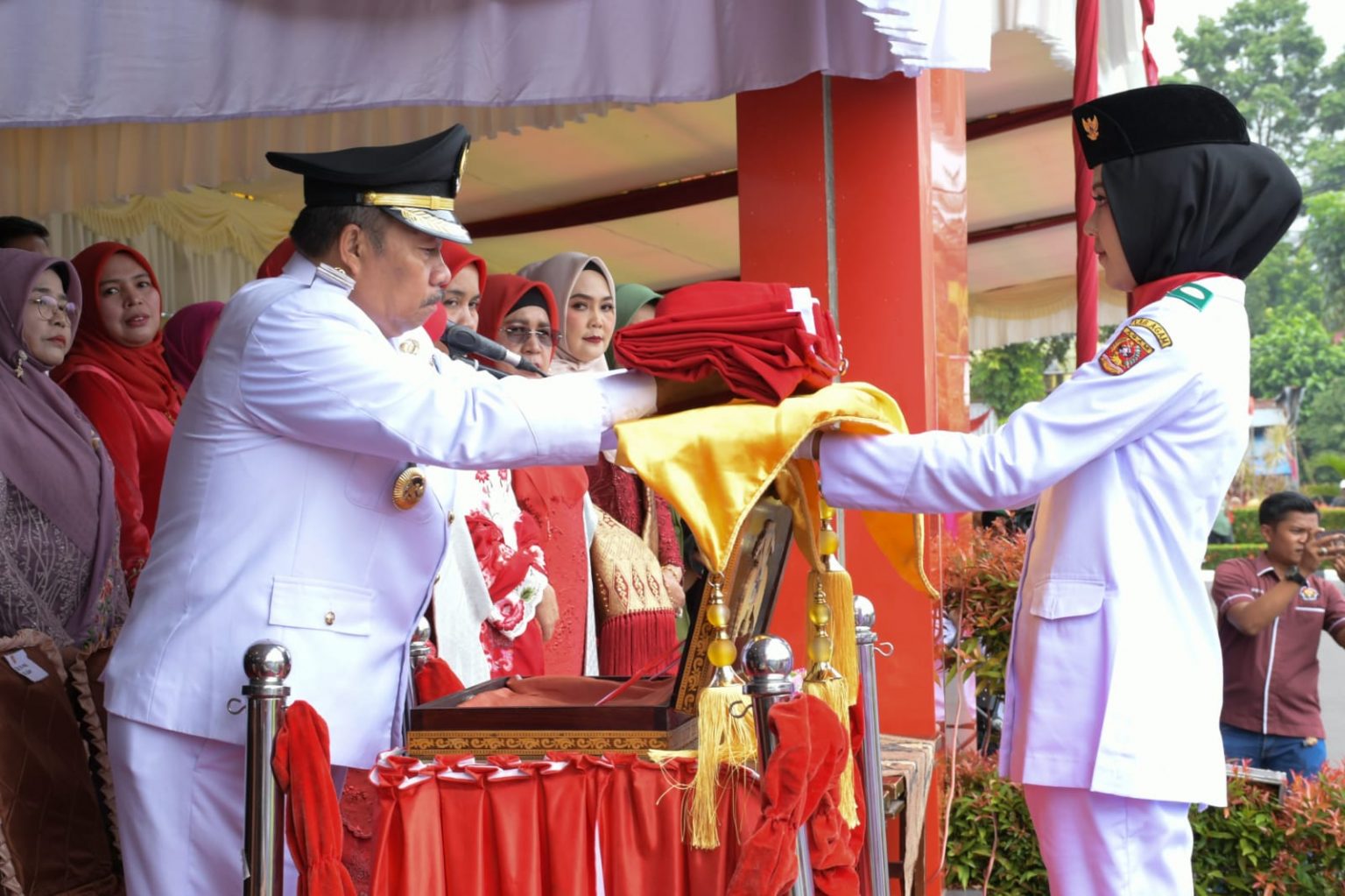 Pembawa baki duplikat Bendera Pusaka Merah Putih pada upacara peringatan Detik-Detik Proklamasi Kemerdekaan RI adalah Citra Barifa Julsa siswi SMAN 1 Lubuk Basung.