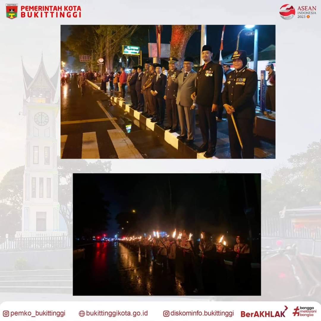 Pawai obor taptu, dimulai dari Lapangan Kantin, melawati Jalan Sudirman, Jam Gadang. Upacara pelapasan juga diikuti Sekda Bukittinggi, bersama Assisten dan seluruh Kepala SKPD se Kota Bukittinggi. (*)