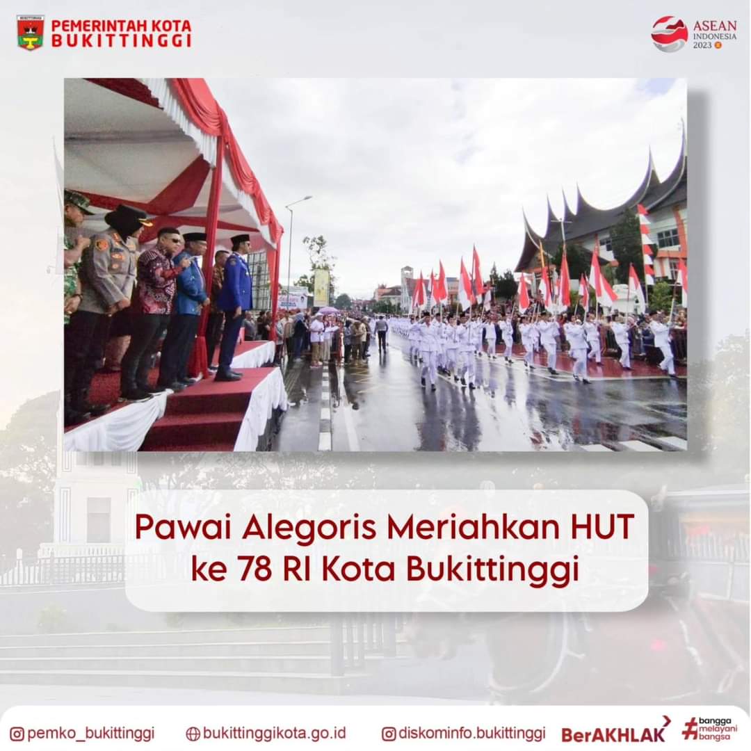 Seperti tahun sebelumnya, Pemko Bukittinggi kembali menggelar pawai alegoris yang diikuti ribuan pelajar dan organisasi serta SKPD se Kota Bukittinggi. Peserta menampilkan kebolehan dan kreatifitasnya dalam rangka memeriahkan HUT ke 78 Republik Indonesia.