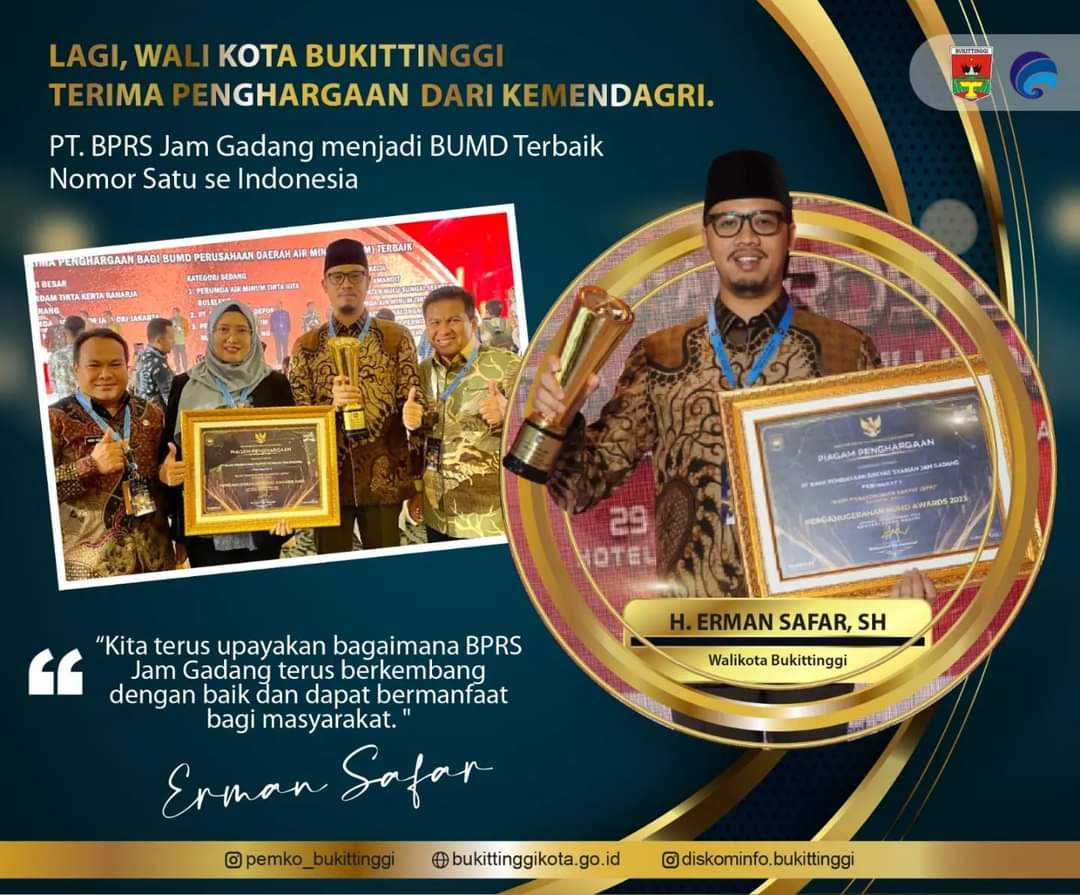 Wali Kota Bukittinggi, H. Erman Safar, SH, mengungkapkan rasa syukur dan bangga terhadap capaian BPRS Jam Gadang. Dalam satu minggu, BUMD milik Pemko Bukittinggi ini, meraih dua penghargaan tingkat nasional. BPRS Jam Gadang, dinilai sebagai salah satu BUMD yang berkinerja terbaik dan memberikan pelayanan prima.