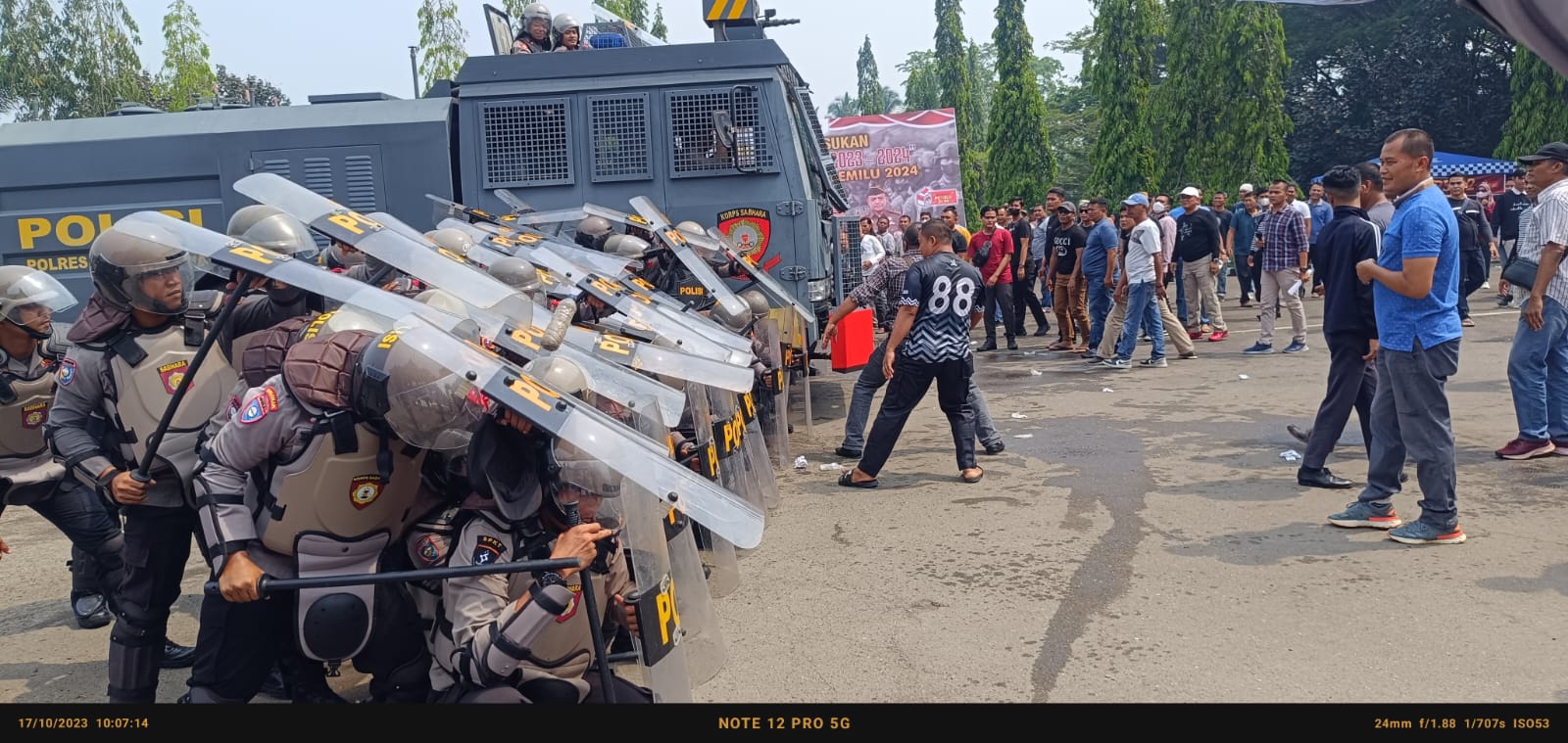 Marawapost.com,Dharmasraya – Polres Dharmasraya menggelar simulasi SISPAMKOTA aksi unjuk rasa berujung ricuh di Komisi Pemilihan Umum Daerah (KPUD) Dharmasraya. Simulasi dilakukan untuk mengantisipasi gangguan Kamtibmas saat Pemilu 2024, dilaksanakan di halaman Kantor Bupati Dharmasraya, selasa (17/10/2023)