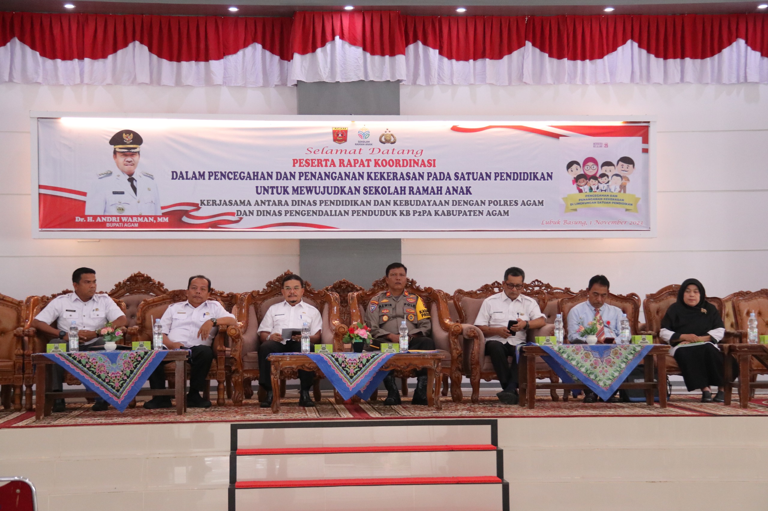 Marawapost.com, Agam – Pemerintah Kabupaten Agam melalui Dinas Pendidikan dan Kebudayaan Kabupaten Agam bekerjasama dengan Dinas Pengendalian Penduduk KB P2PA dan Polres Agam menggelar rapat koordinasi (Rakor) dan sosialisasi dalam pencegahan dan penanganan kekerasan pada satuan pendidikan untuk mewujudkan sekolah ramah anak di Balirung Rumah Dinas Bupati Padang Baru Lubuk Basung, Rabu (01/11/23).
